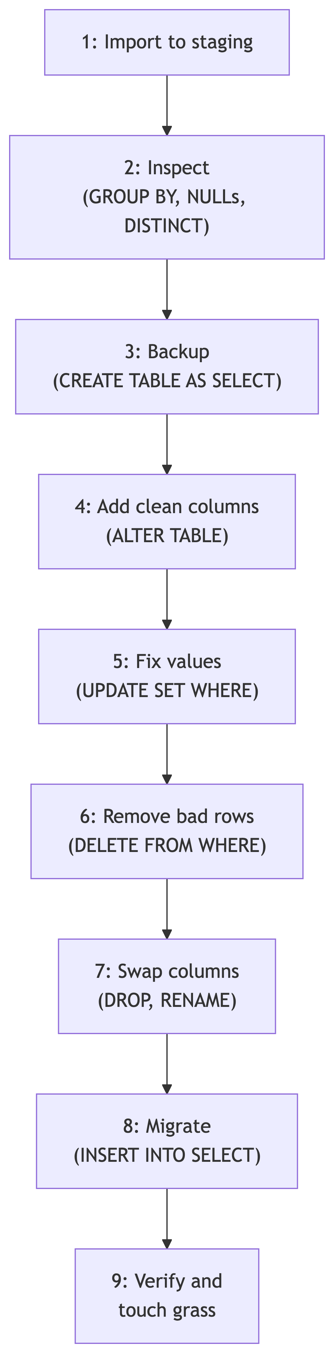 We have covered inspecting data. Now we apply the full pipeline: clean, modify, and migrate.