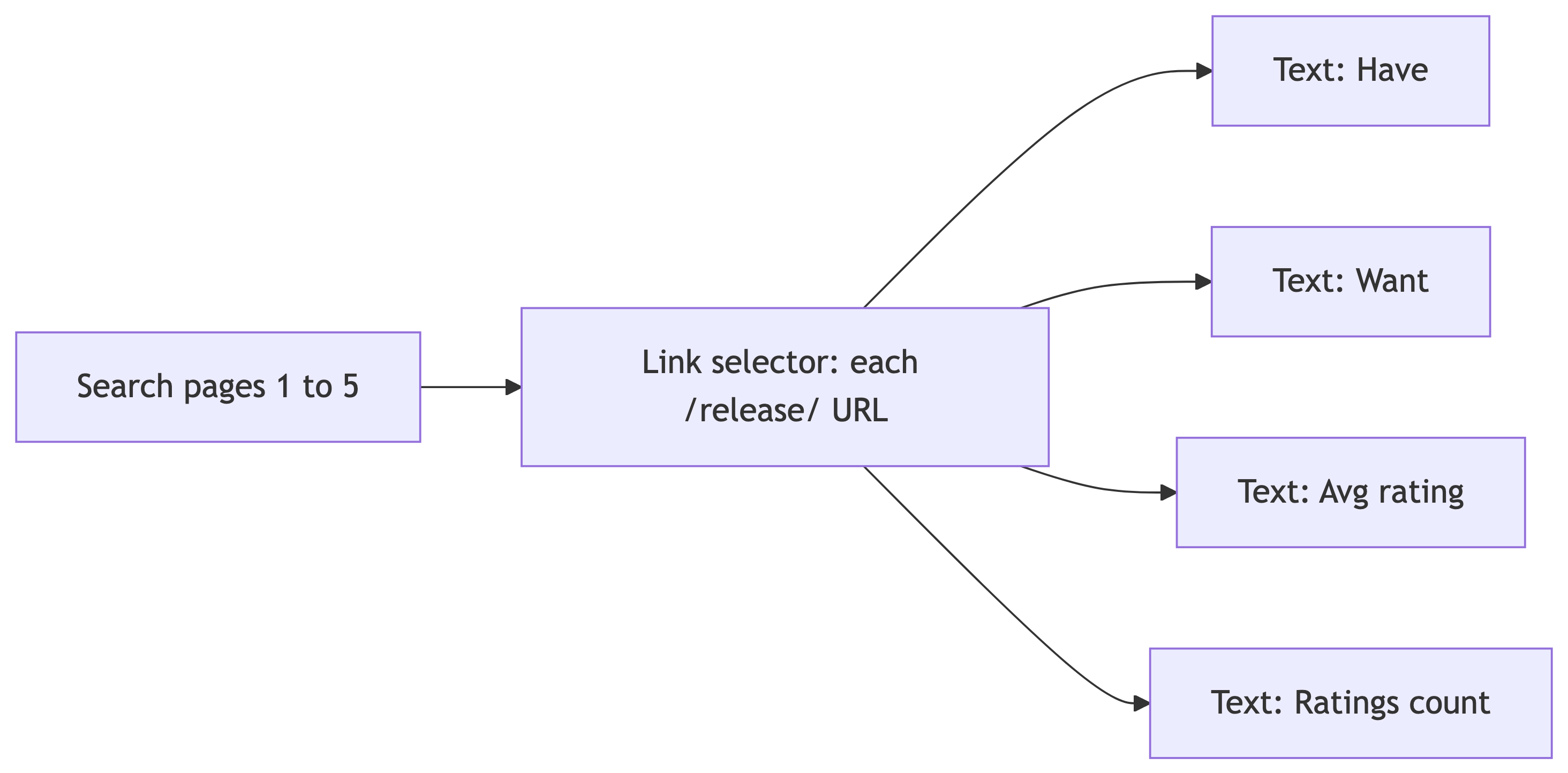 https://www.discogs.com/release/... . Avoid confusing them with master or artist links if multiple anchors appear in the same card; restrict the Link selector with a CSS filter or parent scope so you only enqueue releases.