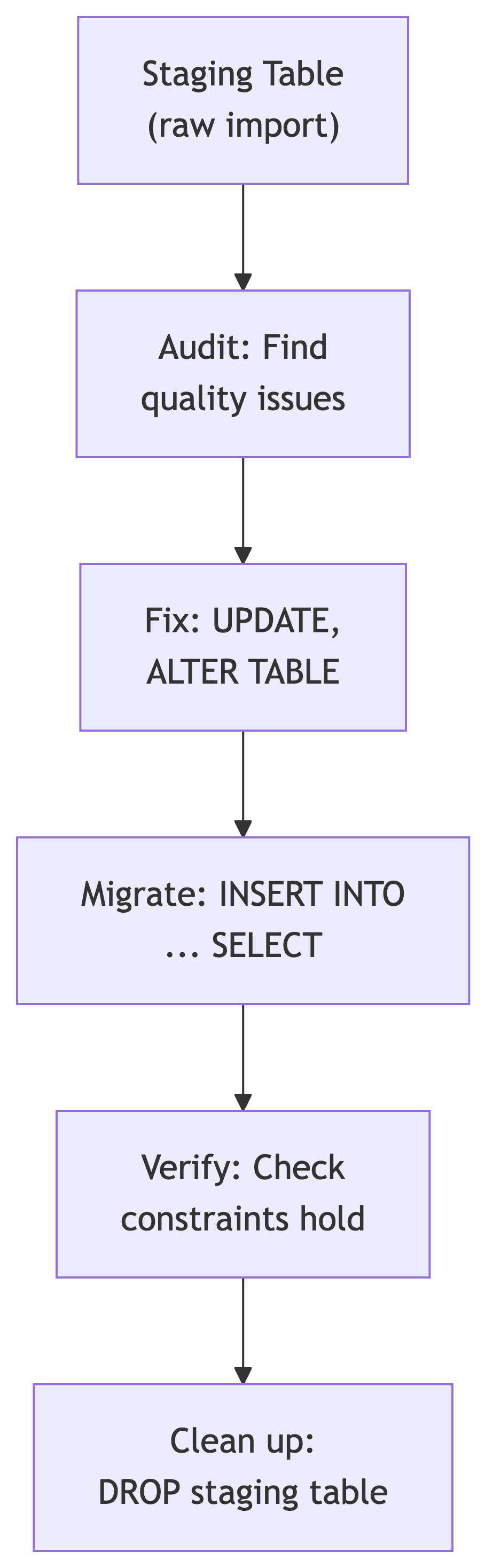 From raw CSV to a clean, normalized, constraint-enforced production database. The entire pipeline. Next, you will apply this pipeline end-to-end on your own with a new dataset.