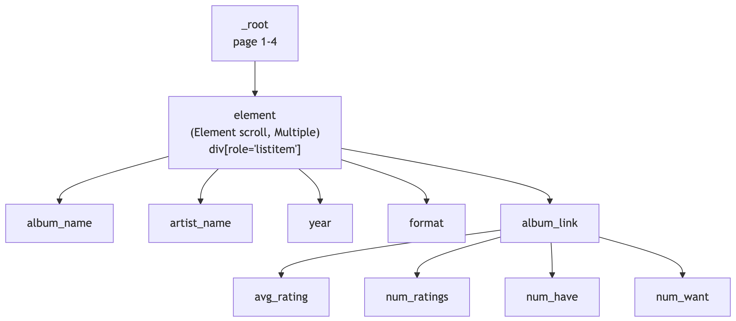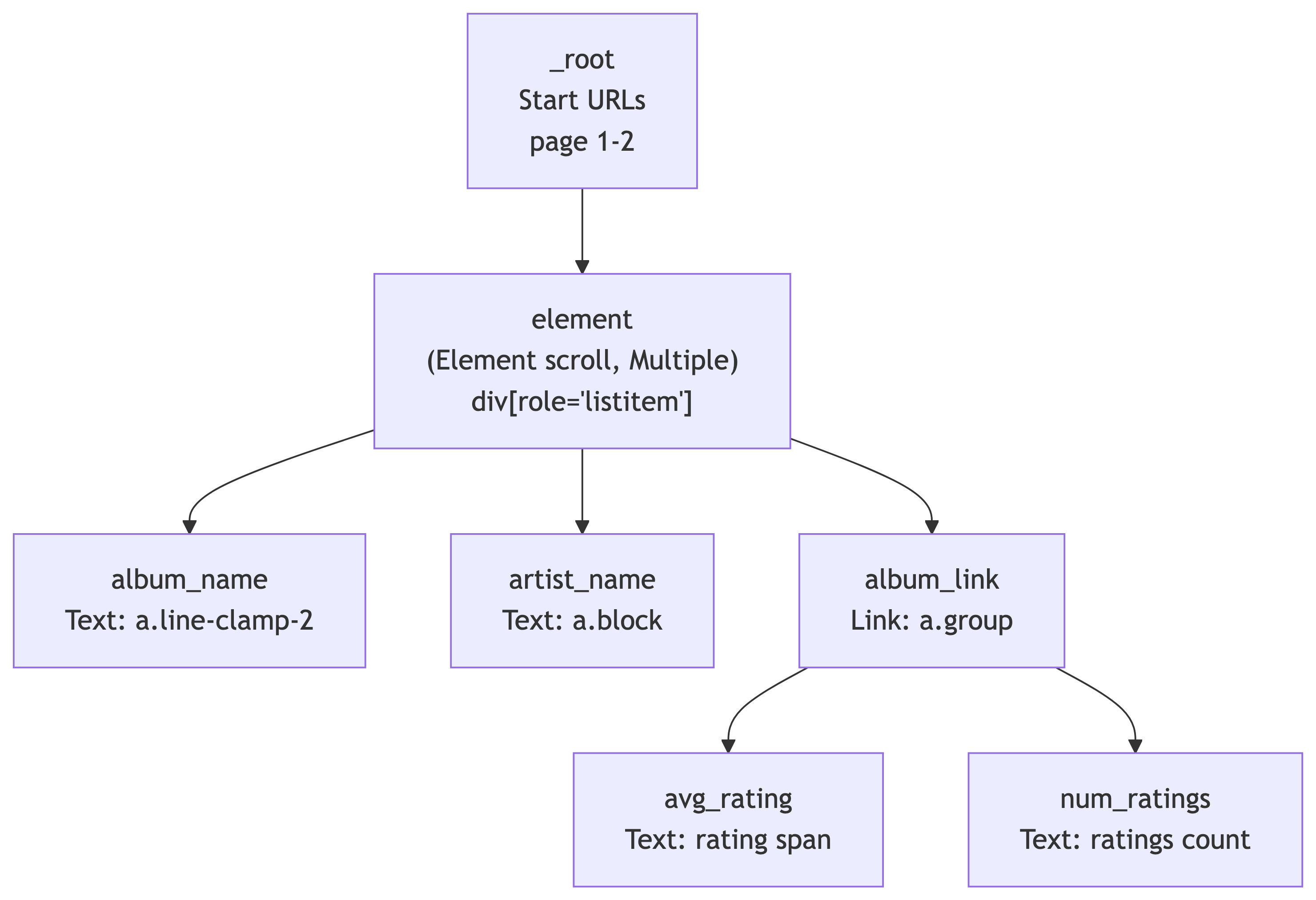 The element selector (Element scroll) handles grouping each search result card. Under it, we extract text (album_name, artist_name) and follow links (album_link) to detail pages where we grab ratings.