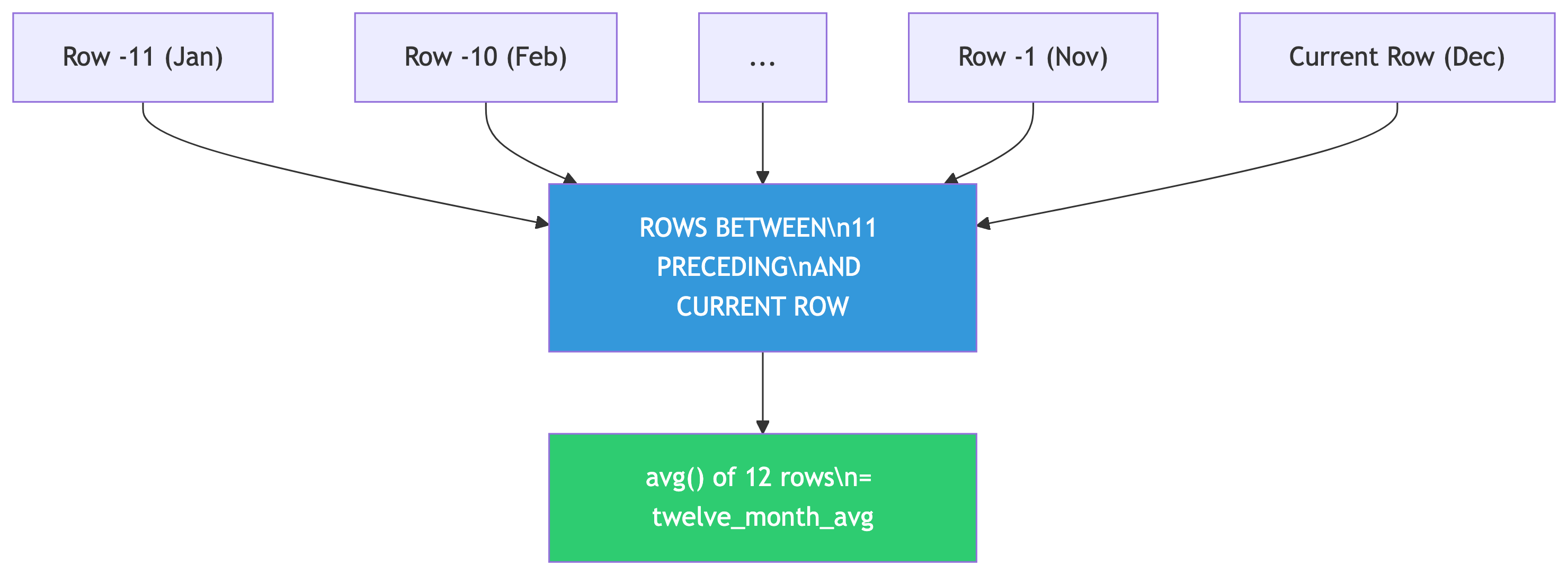 And a warning: missing time periods will throw off your averages! A missing month turns a 12-month average into a 13-month average because window functions count rows, not dates. 🚨