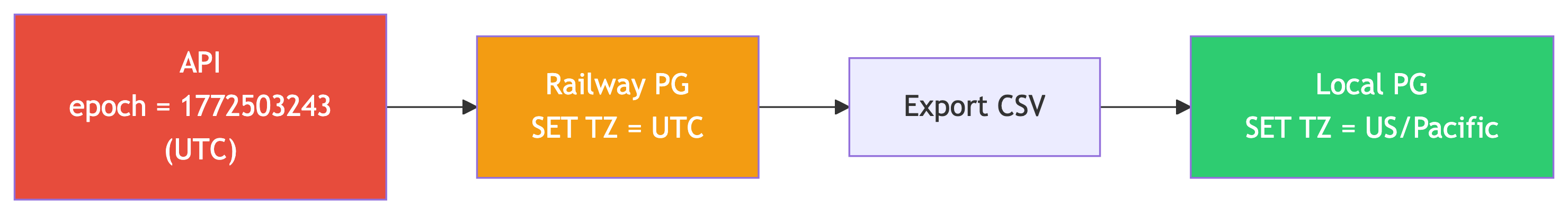 Think about your Railway scrapers. Each row has a created_at timestamp. If that column were timestamp instead of timestamptz, and your Railway instance moved to a different region, your time-series data would silently break. Every record would look like it shifted by hours.