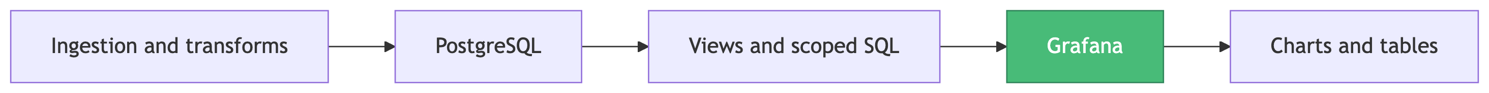 | Data source | PostgreSQL connector in Grafana with correct host and SSL mode for your network path |